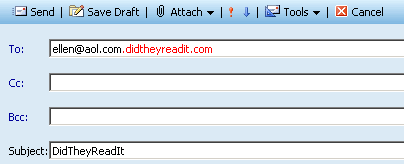 To track emails, all you need to do is add ".DidTheyReadIt.com" to the end of the recipient's e-mail address. For example, if you are sending an e-mail to ellen@aol.com then you would send it to ellen@aol.com.DidTheyReadIt.com instead* and you email will be tracked.