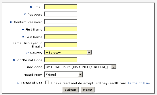 Signing up for DidTheyReadIt is easy - just click here to go to the registration page and sign-up. The registration page looks similar to the image below.